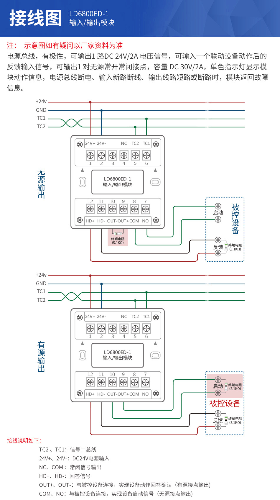 LD6800ED-1輸入/輸出模塊與E/EN/EL系列火災報警控制器配合使用。LD6800ED-1輸入/輸出模塊通過二總線與E/EN/EL系列控制器連接,控制器通過二總線查詢模塊節(jié)點狀態(tài)、設置模塊節(jié)點參數、控制模塊啟動輸出;模塊實時檢測輸入信號、輸入/輸出線路狀態(tài),當出現(xiàn)反饋輸入或者輸入/輸出線路故障時,模塊通過二總線上傳反饋或者故障信號。